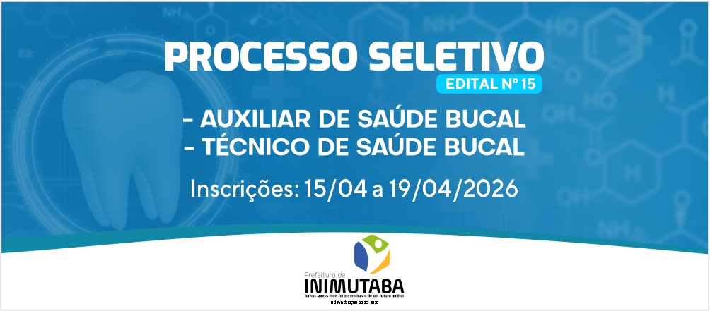 PROCESSO SELETIVO SIMPLIFICADO PARA CONTRATAÇÃO DE AUXILIAR DE SAÚDE BUCAL E TÉCNICO DE SAÚDE BUCAL – EDITAL Nº 15/2026 15/04/2026 12:31 PM Leia mais »